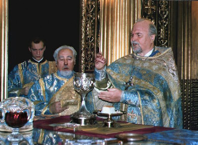 Sacerdote bizantino fazendo o sinal da cruz sobre o cálice